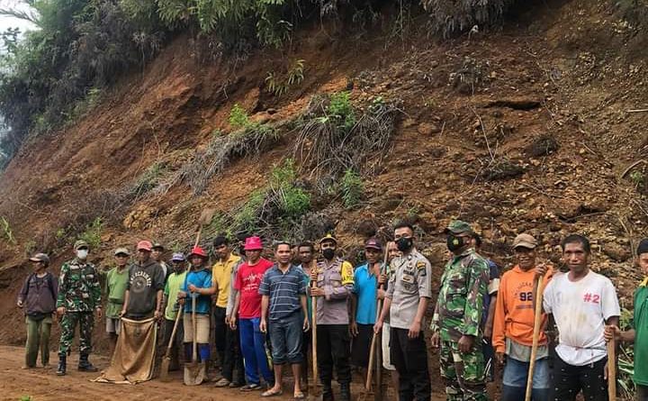 Terasnkri.com | Mabar, NTT – Kapolsek Kuwus Ipda Arsilinus Lentar, memimpin langsung kerja gotong royong membersihkan material berupa tanah longsor