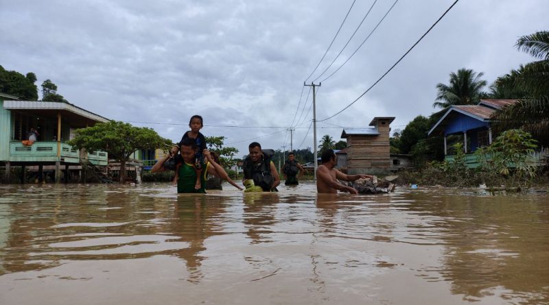 Satgas Pamtas RI – Malaysia Yonarhanud 16/SBC bantu Evakuasi Warga Terkena Banjir