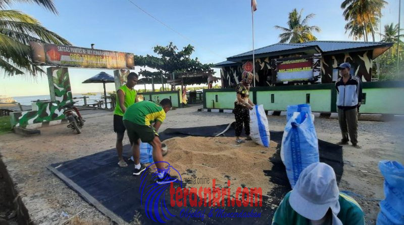 Nunukan – Pos Tanjung Aru Satgas Pamtas RI-Malaysia Yonarhanud 16/SBC bantu warga menjemur gabah untuk meningkatkan kualitas hasil produksi beras.