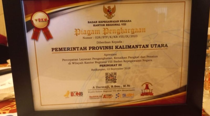 TERASNKRI.COM | TANJUNG SELOR, KALTARA – Pemerintah Provinsi (Pemprov) Kalimantan Utara mendapatkan peringkat ke III atas apresiasi Percepatan Layanan Pengangkatan,