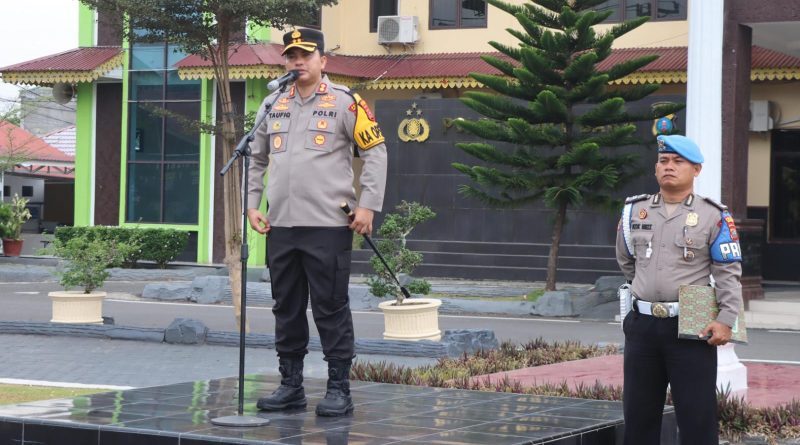TERASNKRI.COM | BATU BARA, SUMUT – Kapolres Batu Bara AKBP Taufiq Hidayat Thayeb, SH.,S.I.K saat mengambil apel jam pimpinan memberikan