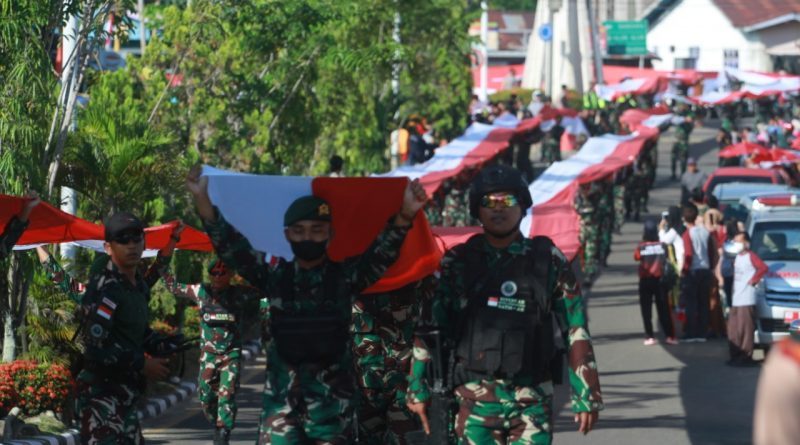 Bentangkan Merah Putih 1 Km, Satgas Pamtas Darat RI-Malaysia Yonif 621/Manuntung Meriahkan Pawai Budaya HUT Kab. Nunukan