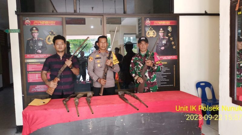 Satgas Pamtas RI-Malaysia Yonif 621/Manuntung Serahkan 8 Pucuk Senjata Penabur Kepada Polsek Nunukan