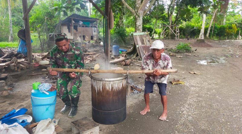 TERASNKRI.COM | MALUKU, NAMLEA – Selain mengerjakan program fisik, anggota Satgas TMMD Ke-120 Kodim 1506/Namlea juga melakukan komunikasi sosial (komsos)